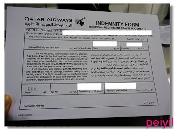 到曼谷,等卡達航空的人上班之後,又簽了一份切結書,表示我們知道機場內沒有過境旅館,待這麼久覺得不舒服不要抱怨(後面這句是自己加的)