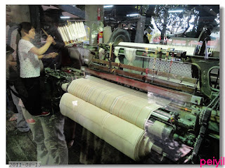 也可以隔著玻璃"監看"機器和工人的工作情形,這工人正在換梭子,剛好旁邊有團體來參觀,解說員說廠裡只有電扇沒冷氣,遊客問為什麼不能吹冷氣,解說員說吹冷氣的話毛巾就會變貴了